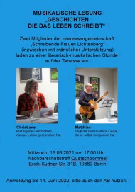 "Fennpfuhlgeschichten". Matthias begleitet sie auf seiner Gitarre und singt selbstkomponierte Lieder. Nachbarschaftshaus "Quatschtrommel", Erich-Kuttner-Str. 31b, 10369 Berlin
