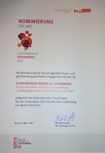 18 Uhr Teilnahme an der Festveranstaltung des Bezirksamtes Lichtenberg m Kulturhaus Karlshorst, Nominierung für den Lichtenberger Preis für frauen- und gleichstellungspolitisches Engagement.